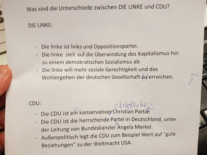 Neben Beobachtung der Landtagssitzung hatte unser palästinensischer Praktikant heute die Frage zu beantworten, was aus seiner Sicht LINKE und CDU unterscheidet. Sein Ergebnis: Teilen mit: Klicke, um auf X zu teilen (Wird in neuem Fenster geöffnet) X Klick, um auf Facebook zu teilen (Wird in neuem Fenster geöffnet) Facebook Gefällt mir Wird geladen … Ähnliche Beiträge