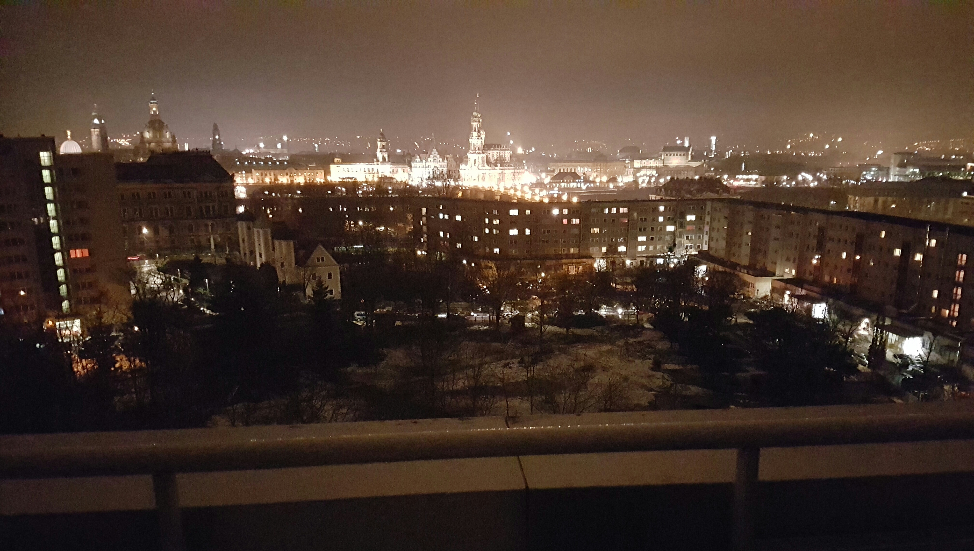 11. Etage auf dem Dach mit Blick auf Landtag, Semperoper, Hofkirche, ein bisschen Frauenkirche usw. Die Staatskanzlei zur Seite fast in Augenhöhe. Was Dresden eben so als Visitenkarte präsentiert. Selbstverständluch habe ich bei allerbestem Netzempfang alle guten Wünsche auf Mailbox, WhatsApp, StayFriends, Facebook, per SMS und Mail freudig zur Kenntnis genommen, auch kein gescheiterter Anrufversuch ist mir, wenngleich mit Zeitverzögerung, entgangen. Aber reden mit der Welt – das sollte hier oben mal einen Tag pausieren.