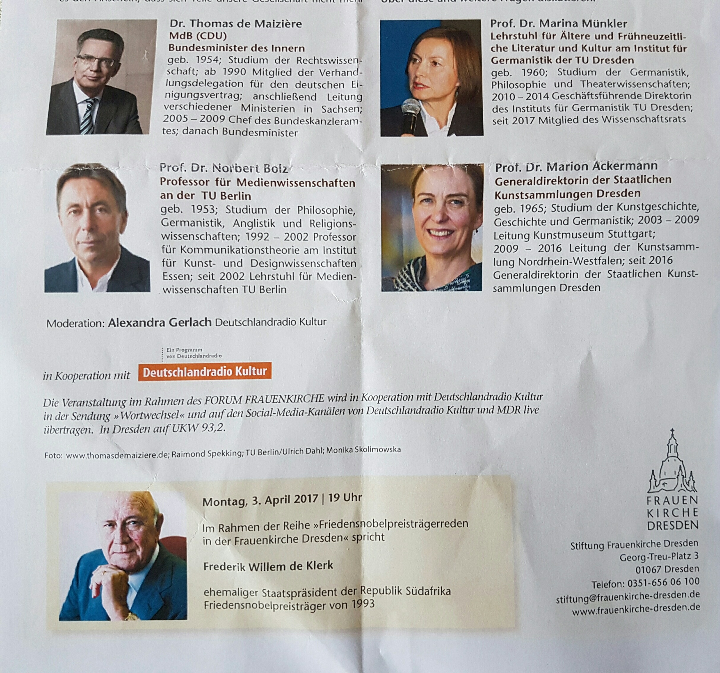 Ob der Uhrmacher aus Glashütte mit den Antworten des Podiums zufrieden ist, weiß ich nicht. Er hat der Polizei vorgeworfen, in Dresden den Hooligans das Feld zu überlassen. Frau Münkler findet es „schwierig“, wenn auf der Straße „Kalifat NRW“ gerufen wird. Und Herr de Maizière würdigt das „rege Demonstrationsgeschehen“, wünscht sich aber weniger Einsatzstunden der Polizei.