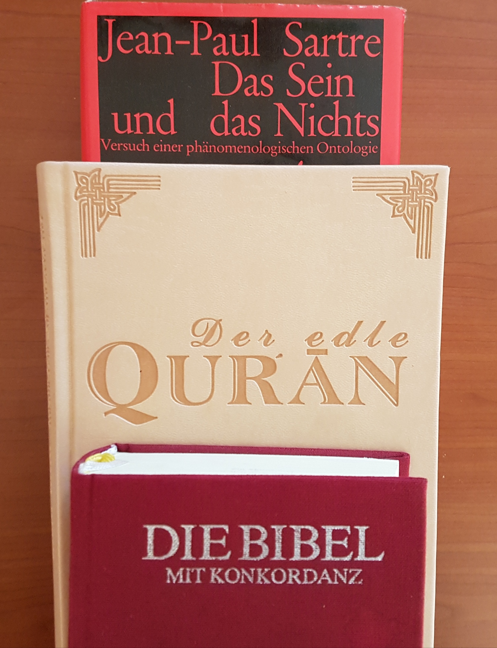 Auch dass sich Sartre, Rahner, Hesse, Nietzsche, Jesus und Mohammad in die Arme fallen und die Bibel neben dem Koran liegt. Und die Juden auch ihre Ziele erreichen. Und Marx auf heimtückische Weise mit dem das Bewusstsein bestimmenden Sein Recht behält. Wir wissen es nicht, weil seine Gedanken nicht unsere sind. Und ganz werden wir es wohl nie begreifen, was „Gott“ und „Welt“ ganz ausmacht.