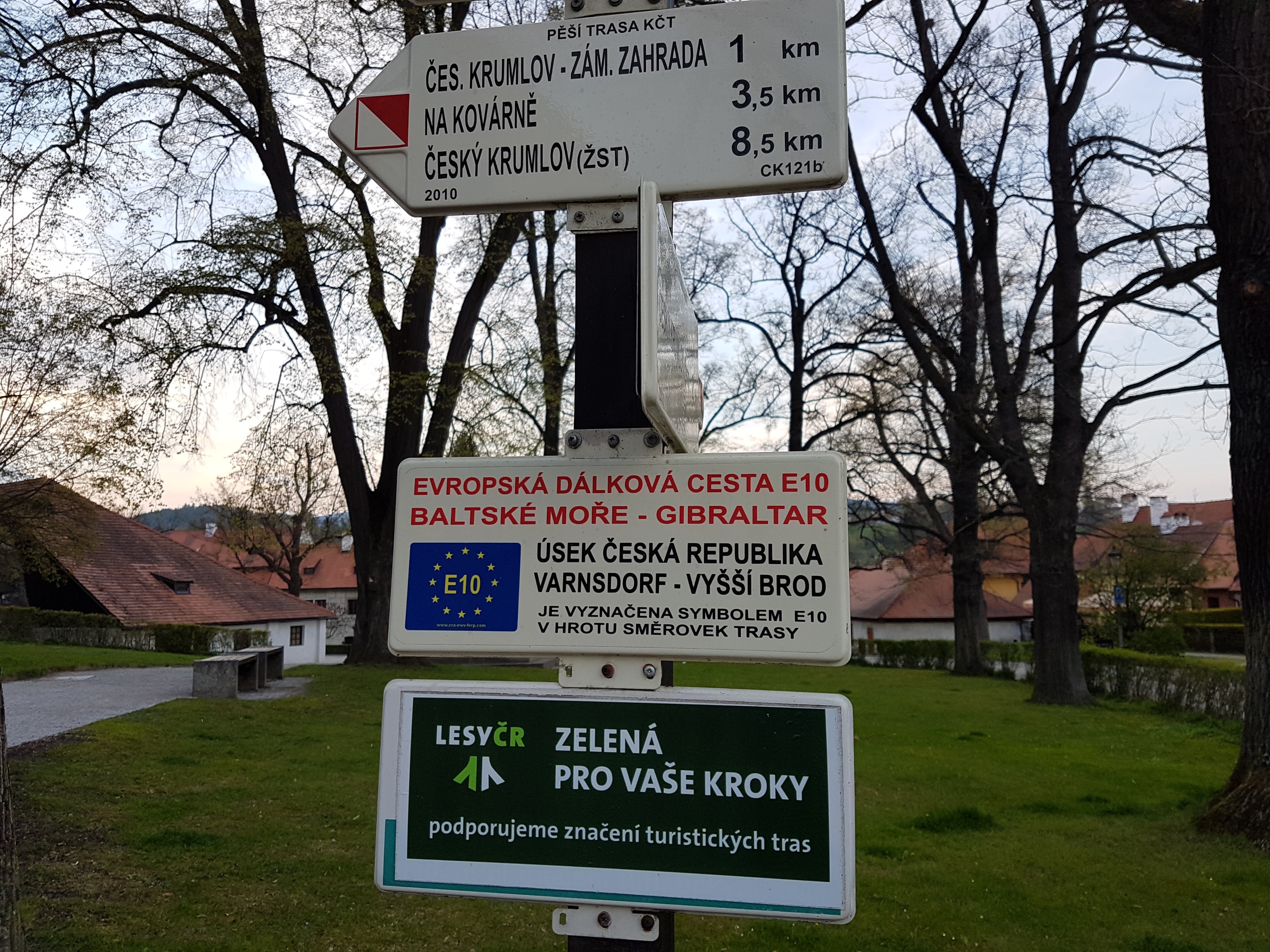 Mit dem Fahrrad von der Ostsee nach Gibraltar – den Weg gibt’s, den Wegweiser dazu erblickten wir in Český Krumlov.