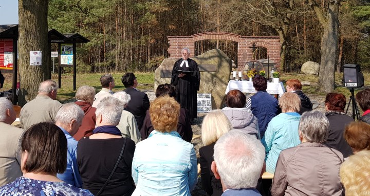 (Grußwort von Marcel Braumann, Vorsitzender des Domowina-Regionalverbandes Hoyerswerda, beim 29. Partwitz-Treffen, 6. April 2019, am Denkmal für Groß Partwitz in Klein Partwitz, das zur Gemeinde Elsterheide gehört, 50 Jahre nach der Abbaggerung des Dorfes. An dem Treffen haben über hundert Menschen teilgenommen.)